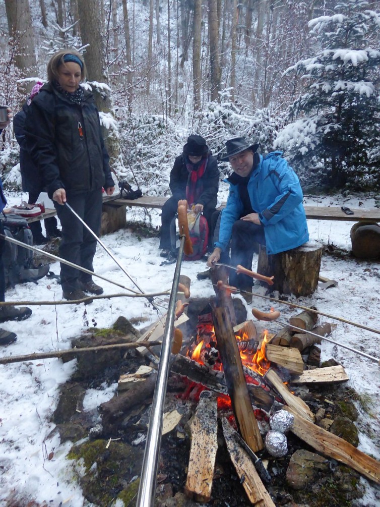 Durch die herrliche Winterlandschaft ging es weiter zur Grillstelle, wo die beiden „Feuermeister“ bereits für angenehme Wärme gesorgt hatten – zumindest von vorne.