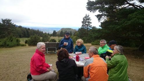 Unsere Wanderung führte uns noch eine weitere Steigung hinauf bis zu einem schönen Aussichtspunkt mit Blick auf Lautlingen und die gegenüberliegenden Berge. Weiter ging es auf den Heersberg, wo wir auf einer schönen Sitzgruppe mit tollem Ausblick Richtung Schalksburg unsere Mittagsrast machten.