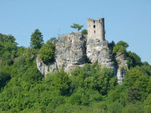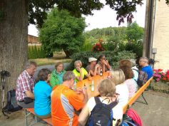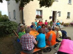 Weiter ging es den Grenzen des Golfplatzes Fränkische Schweiz folgend nach Trainmeusel in die Gartenwirtschaft des Gasthaus Seybert. Gut gestärkt wurde der nächste Abschnitt, vorbei am Trainmeuseler Brunnen und danach zur Burgruine Neideck, in Angriff genommen. Nach einer ausgiebigen Erkundung erfolgte wieder der Abstieg ins Tal und der Rückweg nach Muggendorf.