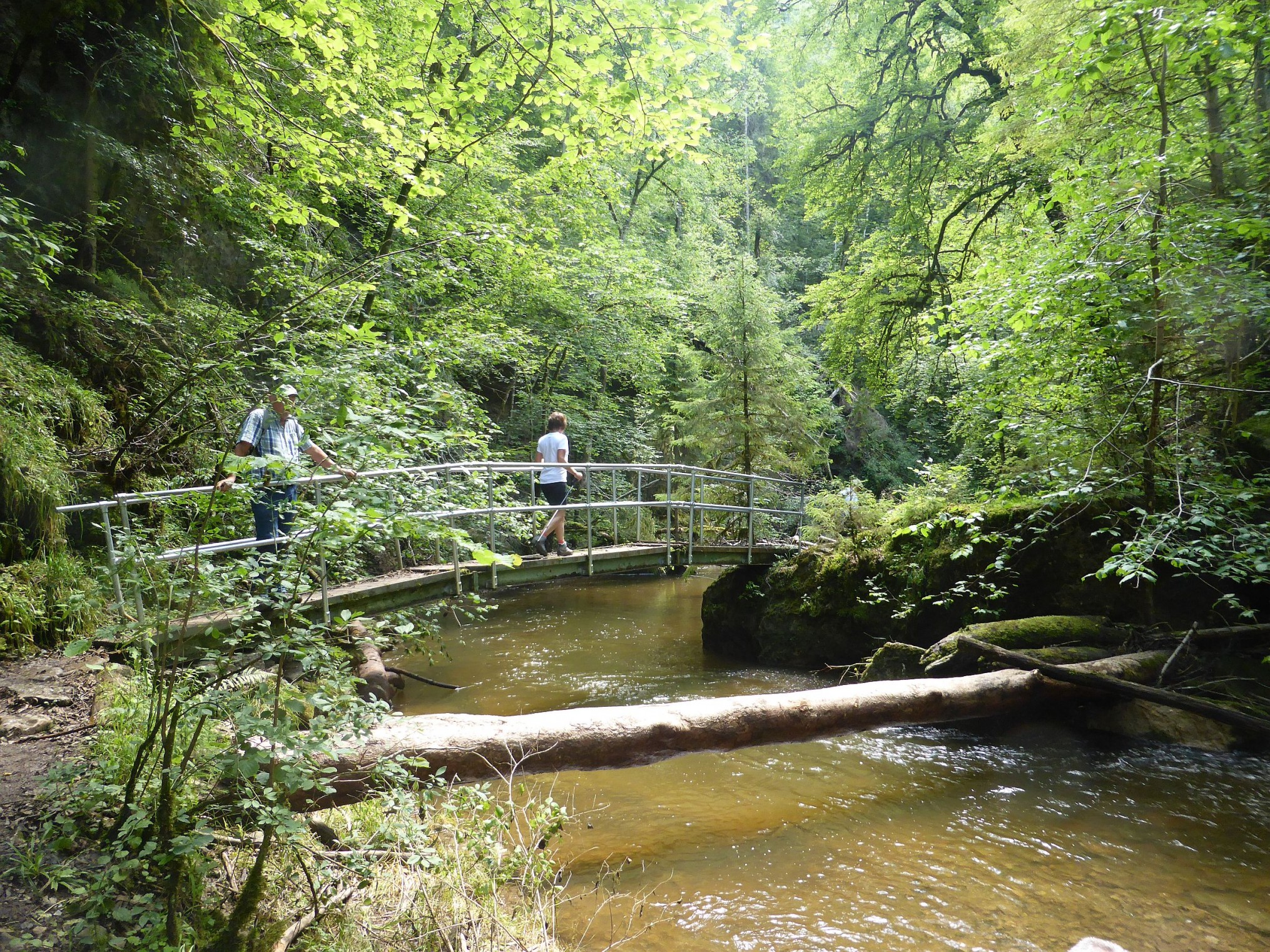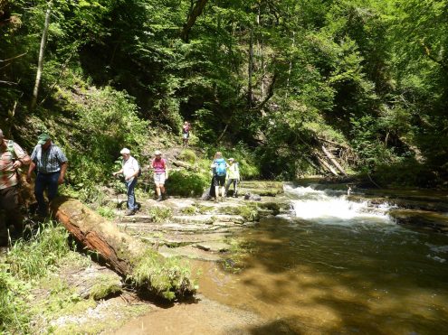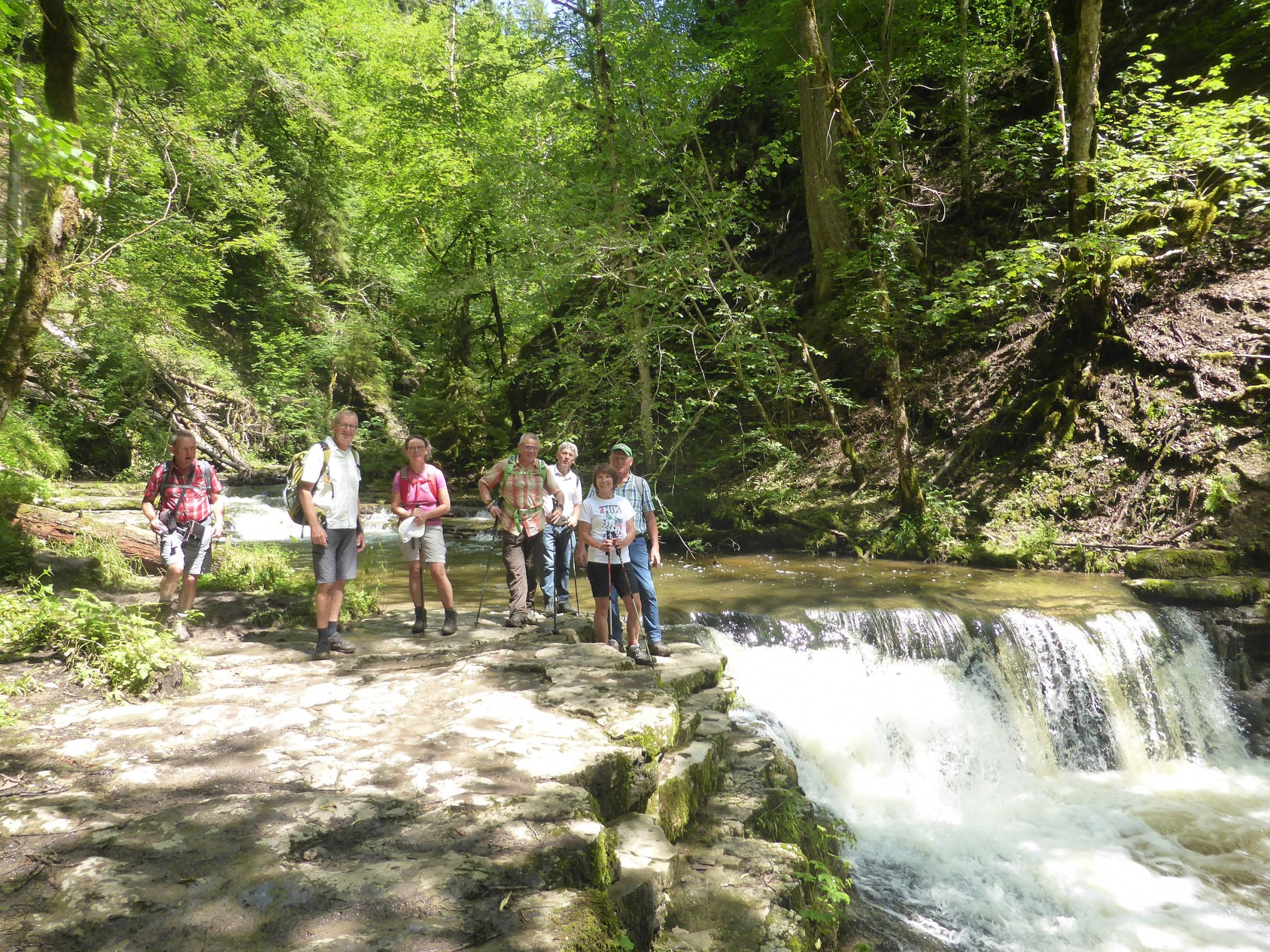 Um 9 Uhr trafen sich 8 Wanderer bei schönem Wetter an der Festhalle Ostdorf. Mit Privat-Pkw fuhren wir zum Wanderparkplatz ca. 2 km außerhalb von Döggingen. Vom Parkplatz aus wanderten wir zurück nach Döggingen und über den Göhrenhag (786m) mit schöner Aussicht auf Döggingen und Richtung Unadingen. Durch den Wald ging es nun hinab zum Posthaus. Da sind auch ein Wanderparkplatz, eine Wassertretanlage, ein Grillplatz und ein hölzernes Tor das den Zugang zur Gauchachschlucht darstellt.