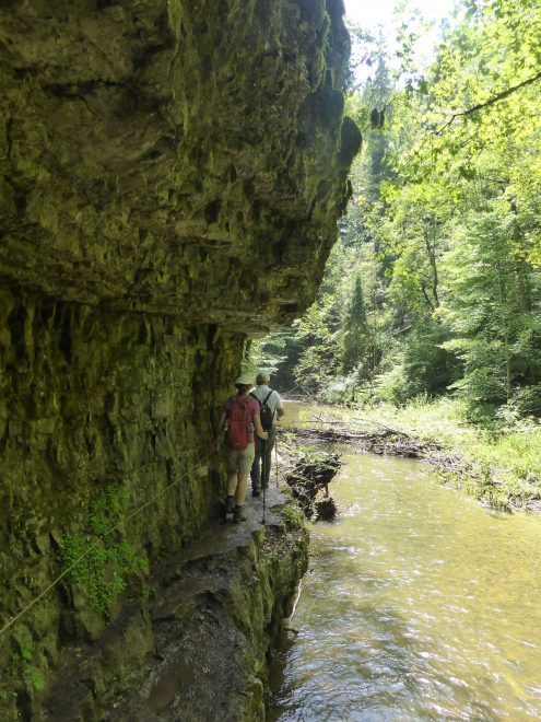 Die weitere Strecke führte uns immer wieder über glitschige Steine, schlammige Wege oder in gebückter Haltung unter Felsvorsprüngen und an seilgesicherten Felswänden dicht am Wasser entlang.