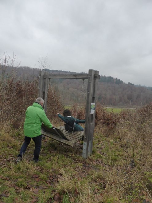 Nach einer kurzen Pause wanderten wir weiter bis zu einem schönen Rastplatz mit einer Schaukelliege und Blick hinab ins Tal.