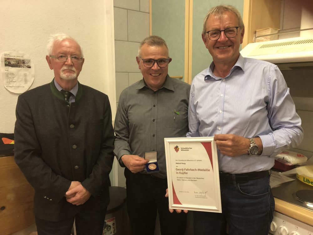 Eine besondere Ehrung gab es für den stellvertretenden Vorsitzenden der Ortsgruppe Helmut Haug. Für seine Verdienste und langjährige Tätigkeit im Schwäbischen Albverein erhielt er aus der Hand von Gau-Obmann J. Ungar die Georg-Fahrbach-Medaille des Hauptvereins.