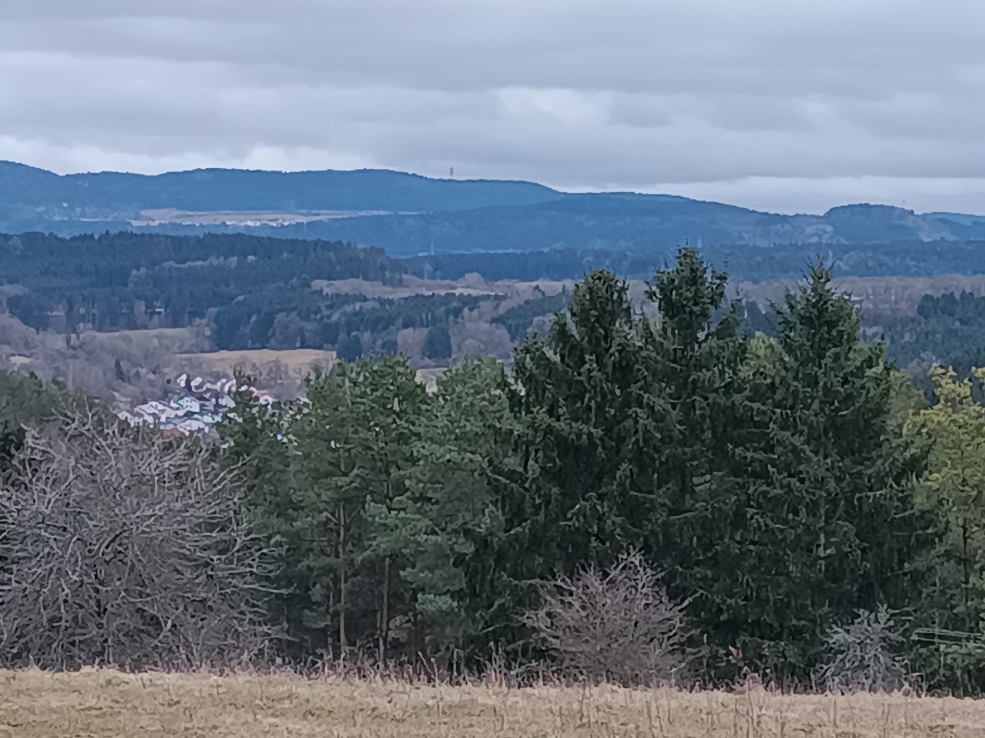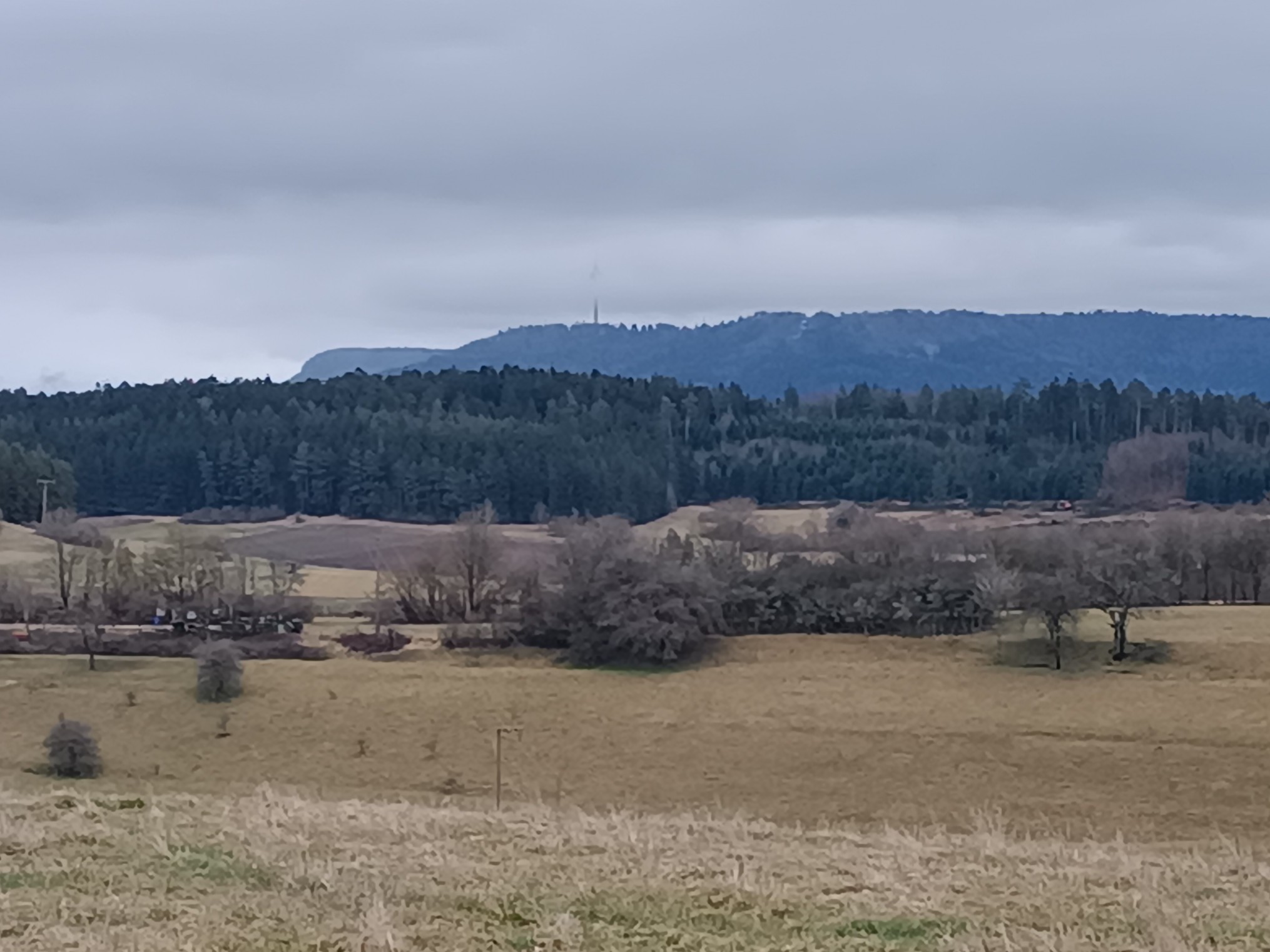 Von der Ortsmitte ging es zunächst leicht bergan auf den Täbinger Heuberg. Trotz starker Bewölkung zeigten sich in der Ferne der Plettenbergturm und der Lembergturm.