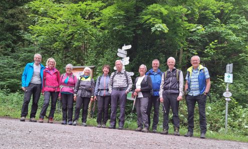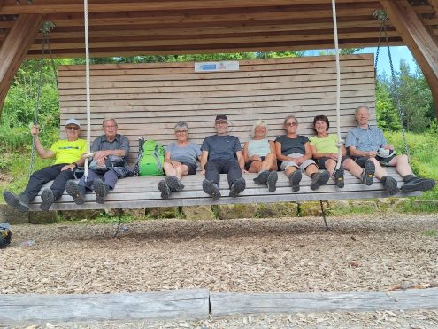Nach einem wieder ausgezeichneten Frühstück hieß es Abschied nehmen von den freundlichen Gastgebern im Hotel „Am Mühlbach“ in Forbach. Mit den Autos ging es bei wiederum schönen Wetter nach Baiersbronn. Die Wanderstrecke führte zunächst stets leicht ansteigend in Richtung Mitteltal. Oberhalb des Ortes Obertal lud eine Riesenschaukel mit schöner Aussicht zur Mittagsrast ein. Anschließend ging es durch ein wunderschönes Hochtal in Richtung Schliffkopf. Doch vorher waren nochmals einige Hundert Höhenmeter zu bewältigen. Nach rund 6 Stunden Wanderzeit war dann das große Ziel – der 1.055 m hohe Schliffkopf, zugleich das Ende der „Murgleiter“ erreicht. Leider verzog sich die Sonne hinter dichten Wolken, so dass die Rundumsicht etwas eingeschränkt war. Nach dem obligatorischen Abklatschen schlug Wanderführer Helmut vor, noch weiter bis zum „Ruhestein“ und dem dortigen Nationalparkzentrum zu wandern. So kamen nochmals 4,5 km Wegstrecke hinzu, die aber von allen gut gemeistert wurden. Mit dem Bus ging es dann zurück nach Baiersbronn, wo vor der Rückfahrt noch eingekehrt wurde. Es war einmal mehr eine tolle, abwechslungsreiche aber auch sehr anspruchsvolle Wandertour.
