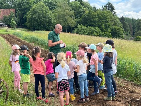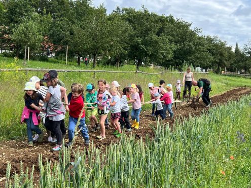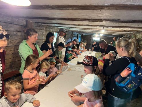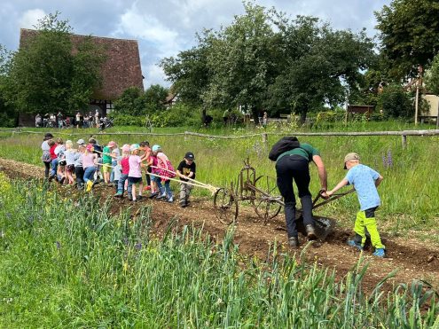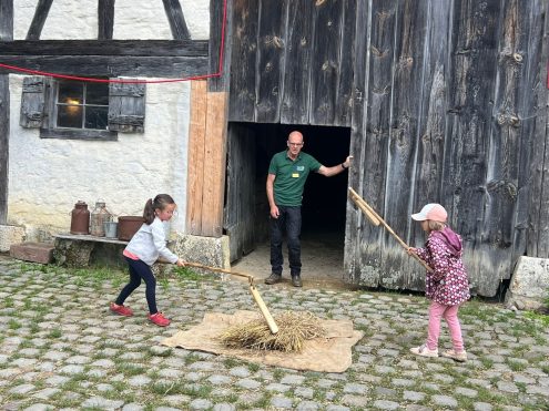 Kürzlich besuchte die Familiengruppe des Schwäbischen Albvereins Ostdorf das Freilichtmuseum in Neuhausen ob Eck. 15 Familien mit 31 Kindern und 27 Erwachsenen nahmen an dem Ausflug teil. Vor Ort erwartete die Kinder und ihre Eltern den Workshop „Vom Korn zum Brot“. Wie früher durften die Kinder den Museumsacker pflügen und das Korn einsäen. Anschließend dreschten die Kinder die Ähren mit Hilfe eines Dreschschlegels. Um zu sehen, wie das Mahlen früher funktionierte, wurde die Museumsmühle besucht. Abschließend durfte jedes Kind sein eigenes Fladenbrot kneten und belegen und dieses dann ofenfrisch aus dem Holzbackofen verzehren. Ein weiterer Höhepunkt war die Schweinehut durch den Ort, bei dem die Familien die Schweine hautnah erlebten und interessantes Wissen über sie erfuhren. Das gemeinsame Grillen und der Besuch auf dem Spielplatz im Museum rundeten den erlebnisreichen Tag, der von Melanie und Martin Prothmann organisiert wurde, ab.