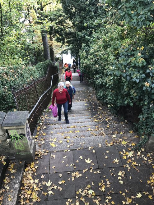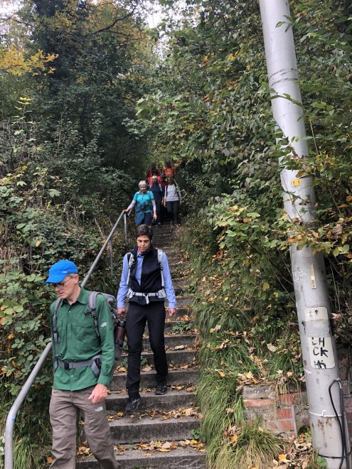 Durch die Weinberge ging es anschließend in den Talkessel und plötzlich war man in einer anderen Welt. Große Mietshäuser, Straßenverkehr und Lärm – welch ein Kontrast. Jetzt kamen auch die ersten Staffeln – sprich Treppen. Und so ging es nun wieder bergan, der Alten Weinsteige entlang hinauf nach Degerloch.