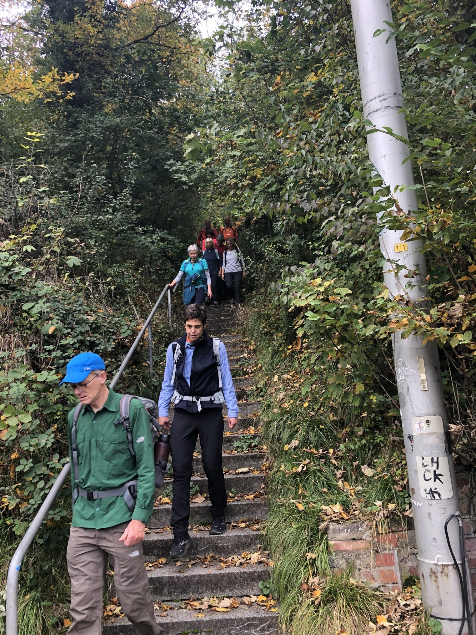 Von hier führt die Zahnradbahn hinauf zum Waldfriedhof, doch keiner der Teilnehmer nahm diese Gelegenheit wahr und so nahmen alle den letzten steilen Anstieg hinauf in Angriff. Es waren nicht die 14 km Wanderstrecke, sondern die vielen Staffeln, das stetige Auf und Ab, das die Tour zu einer echten Herausforderung machte. Doch Alle erreichten nach rund 5 Stunden Wanderzeit bei bester Stimmung das Ziel und freuten sich über die abwechslungsreiche und interessante Tour.