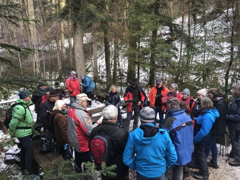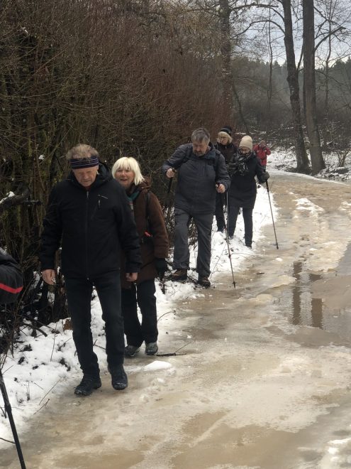 Zunächst ging es am Friedhof vorbei in Richtung „Hammerstall“. Kaum war man im Wald bedeckten Schnee- und Eisreste den Weg und beim Gehen war Vorsicht angesagt. Bei der Owinger Gipsmühle auf dem Weg ins Mildersbachtal gab es für die Wanderer die nächste große Herausforderung, denn eine riesige Eisplatte bedeckte den gesamten Waldweg. Aber alle schafften das Hindernis und der weitere Wegverlauf bot dann keine weitere Schwierigkeit.