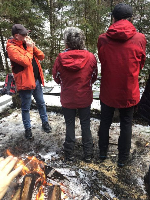 Gegen 12.30 Uhr war die Grillstelle im Mildersbachtal erreicht und die „Feuermeister“ Arnold Viehbeck, Werner Hausmann und Rolf Keller hatten zwei prächtige Lagerfeuer vorbereitet. So konnte man sofort sein Rucksackvesper auspacken und die Würste in das Feuer halten. Bald war die Luft vom guten Geschmack der gegrillten Köstlichkeiten erfüllt. Auch machten wieder viele Süßigkeiten und die restlichen Weihnachtsbretle die Runde. Bevor es weiterging wurden dann noch zwei Lieder gesungen. Zudem klarte der Himmel auf und einige Sonnenstrahlen schafften es sogar bis ins Tal. Zurück ging es nun den Weg hinauf zum Eichbrunnen und weiter in Richtung Schützenhaus.